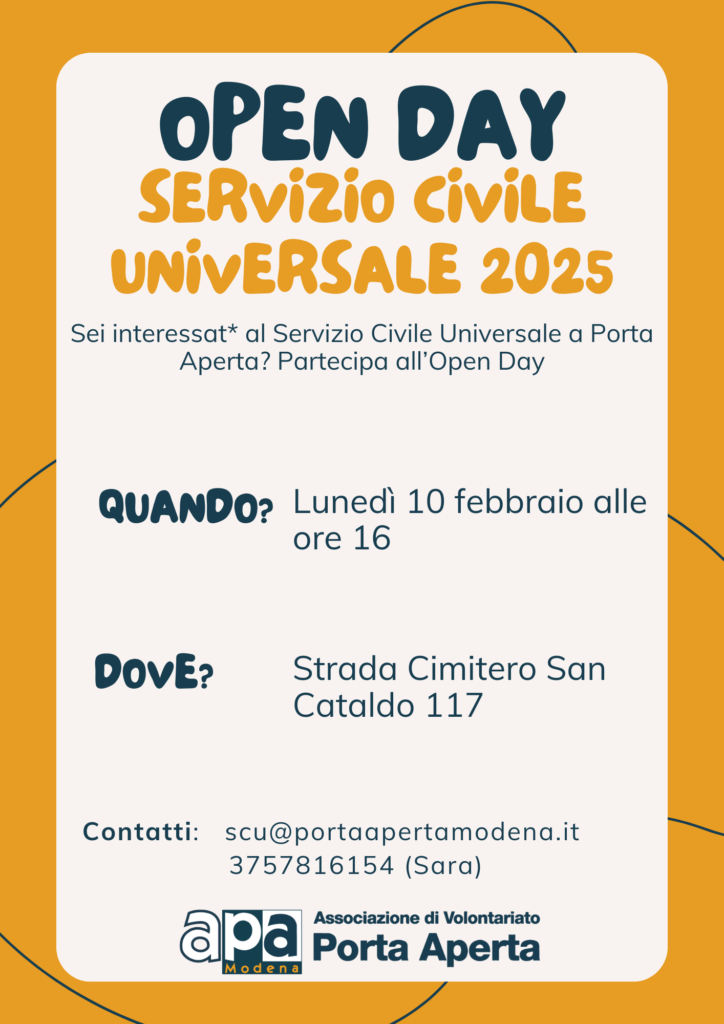 Open Day Associazione Porta Aperta di Modena – Lunedì 10 febbraio alle ore 16 presso la sede di Via Cimitero San Cataldo 117 – Modena.